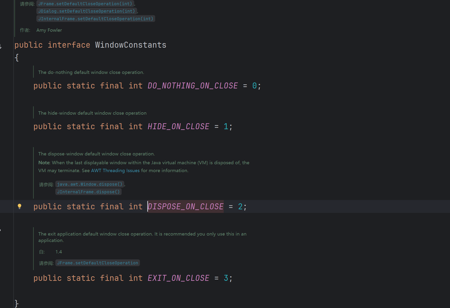 意识到是setDefaultCloseOperation设置的不同导致的。为了弄清这些退出的不同,我点开了DISPOSE_ON_CLOSE的原代码查询