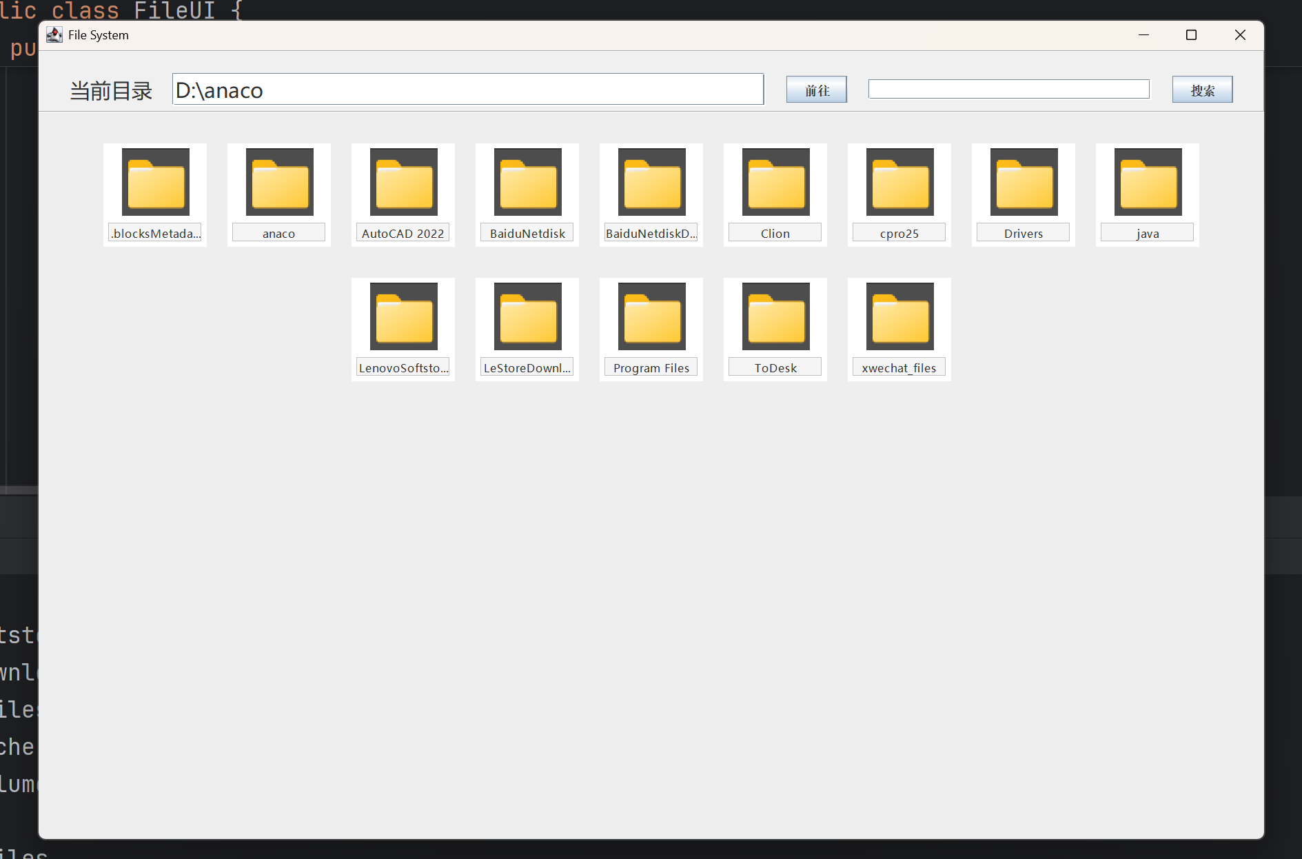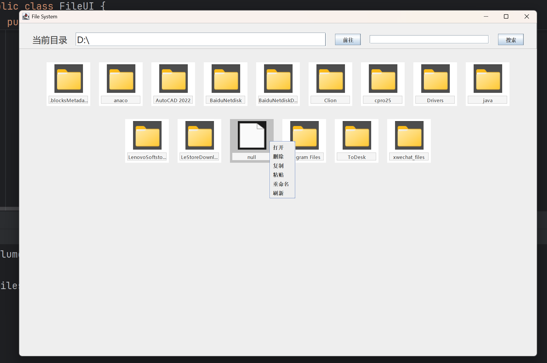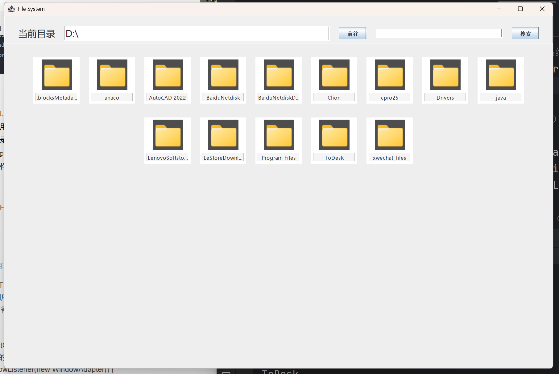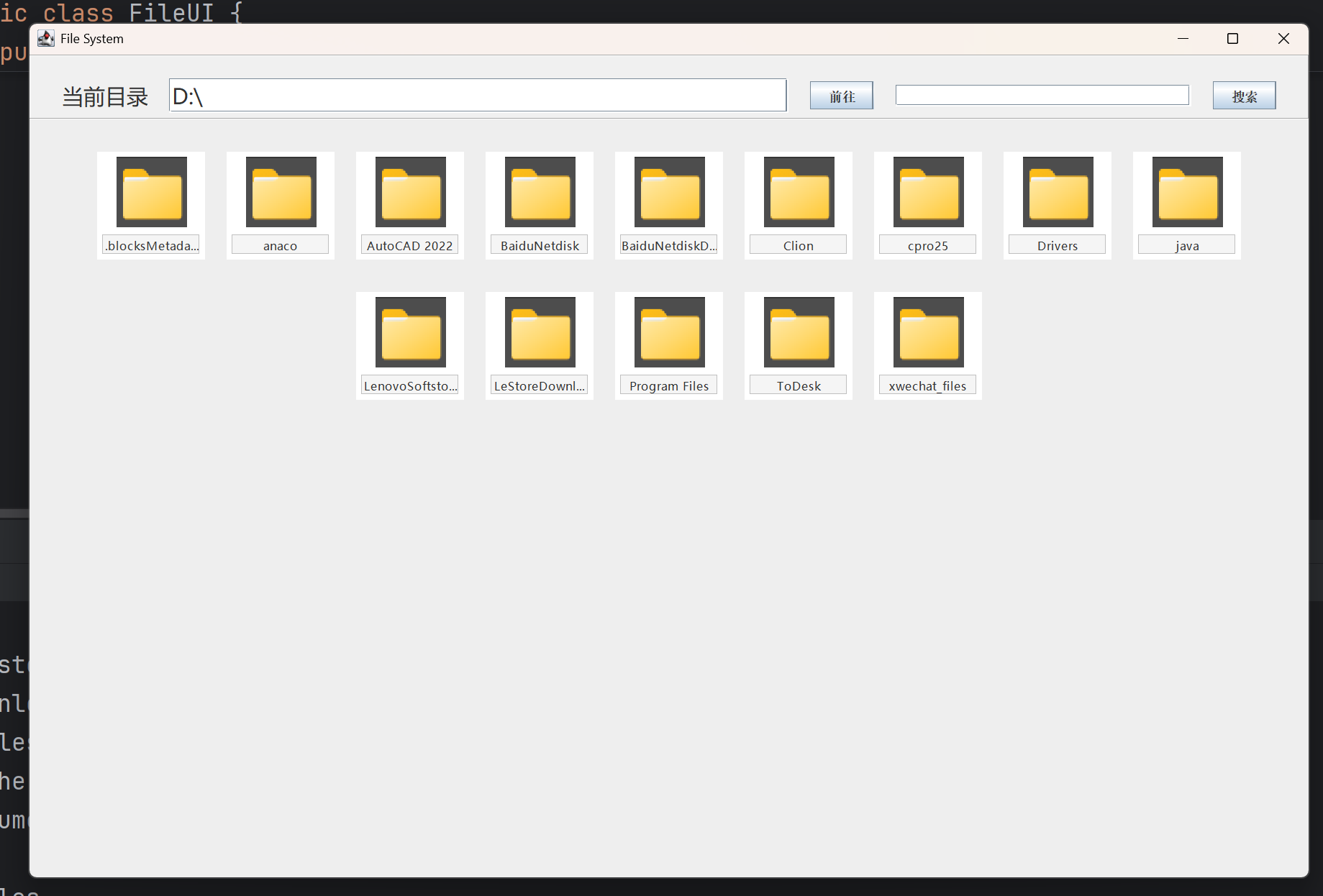 HashMap管理窗口,实现 "一个目录对应一个窗口" 的K-V映射,避免重复打开相同目录窗口; - 初始化时指定默认目录(D 盘)。