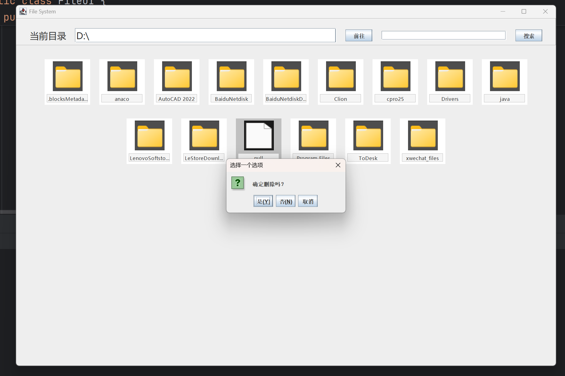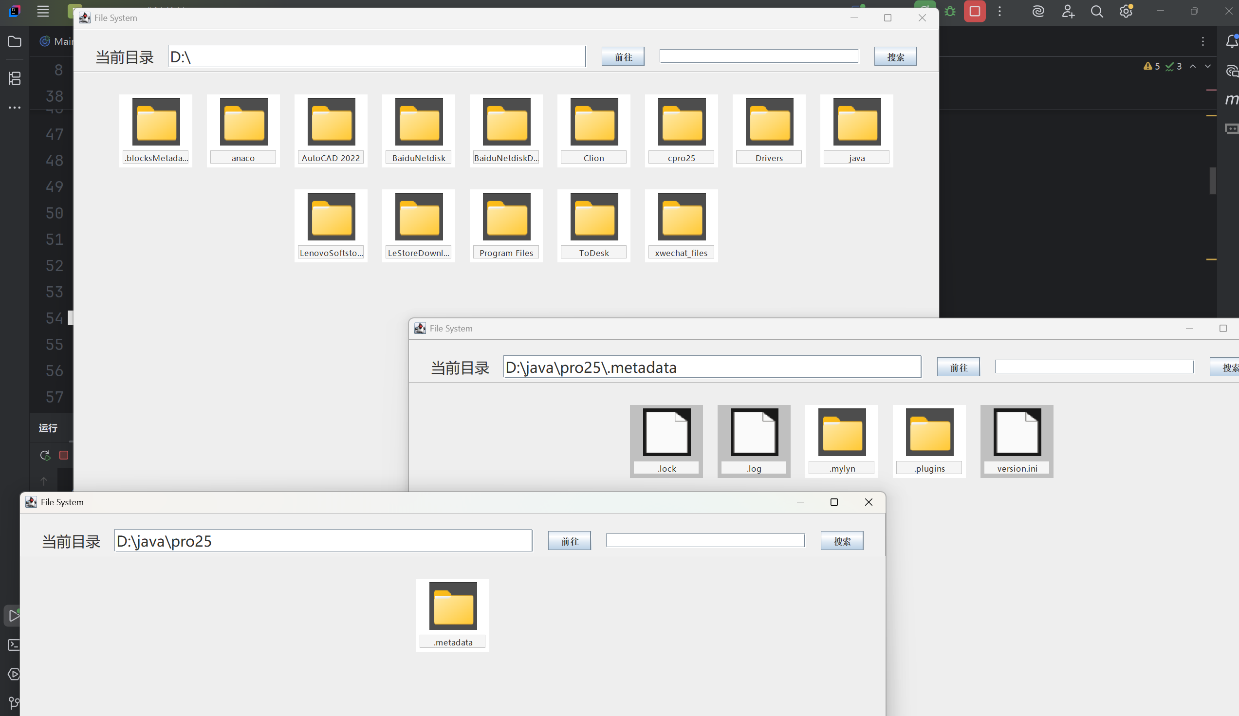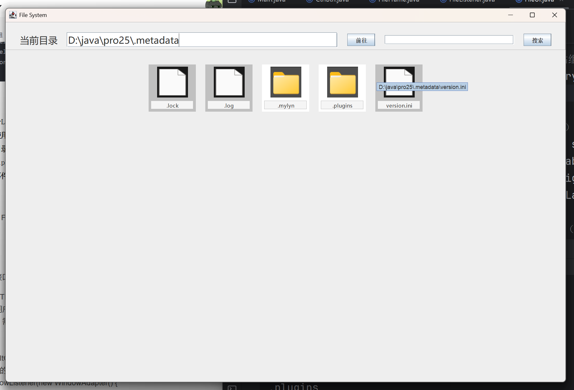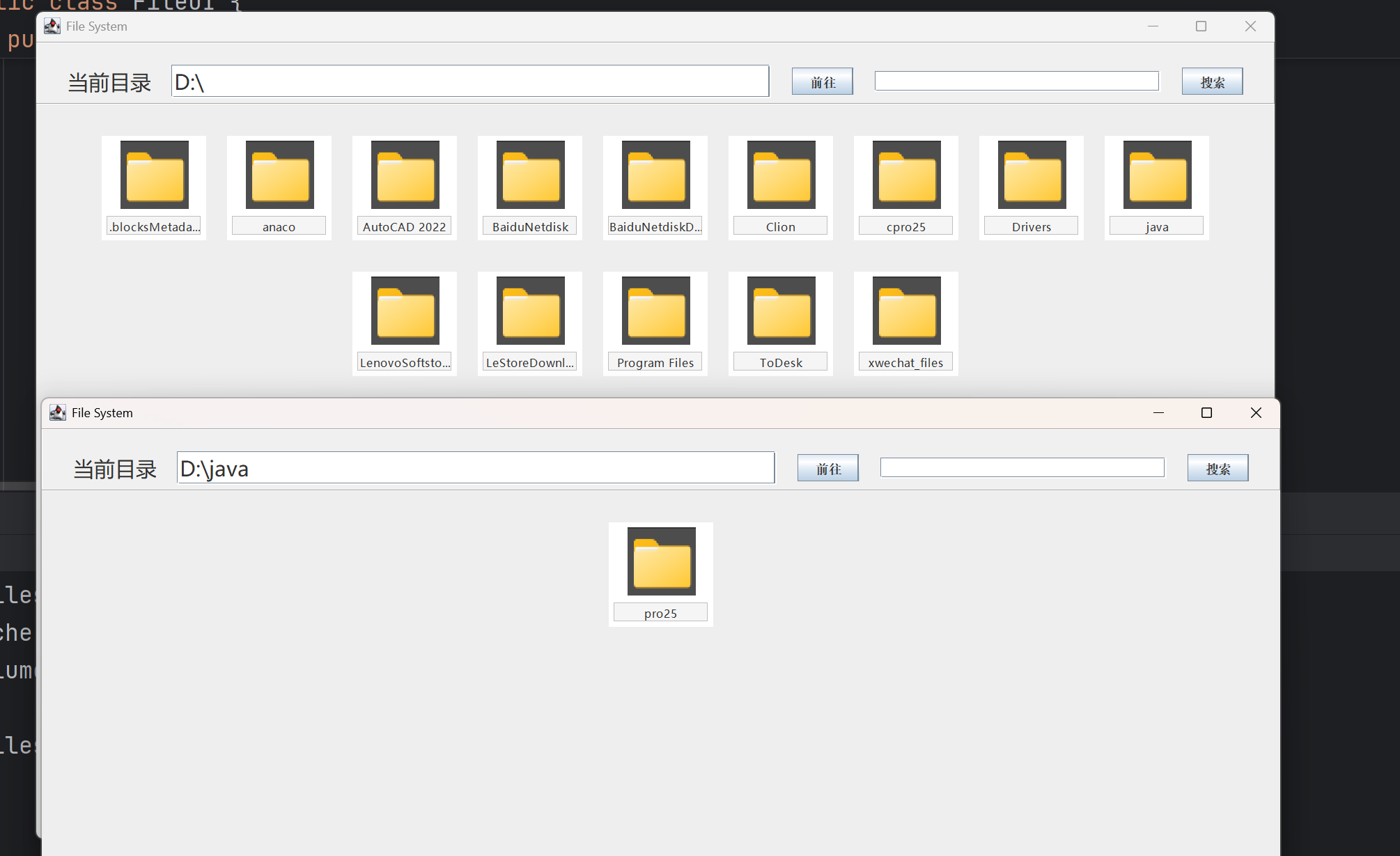 HashMap管理窗口,实现 "一个目录对应一个窗口" 的K-V映射,避免重复打开相同目录窗口; - 初始化时指定默认目录(D 盘)。