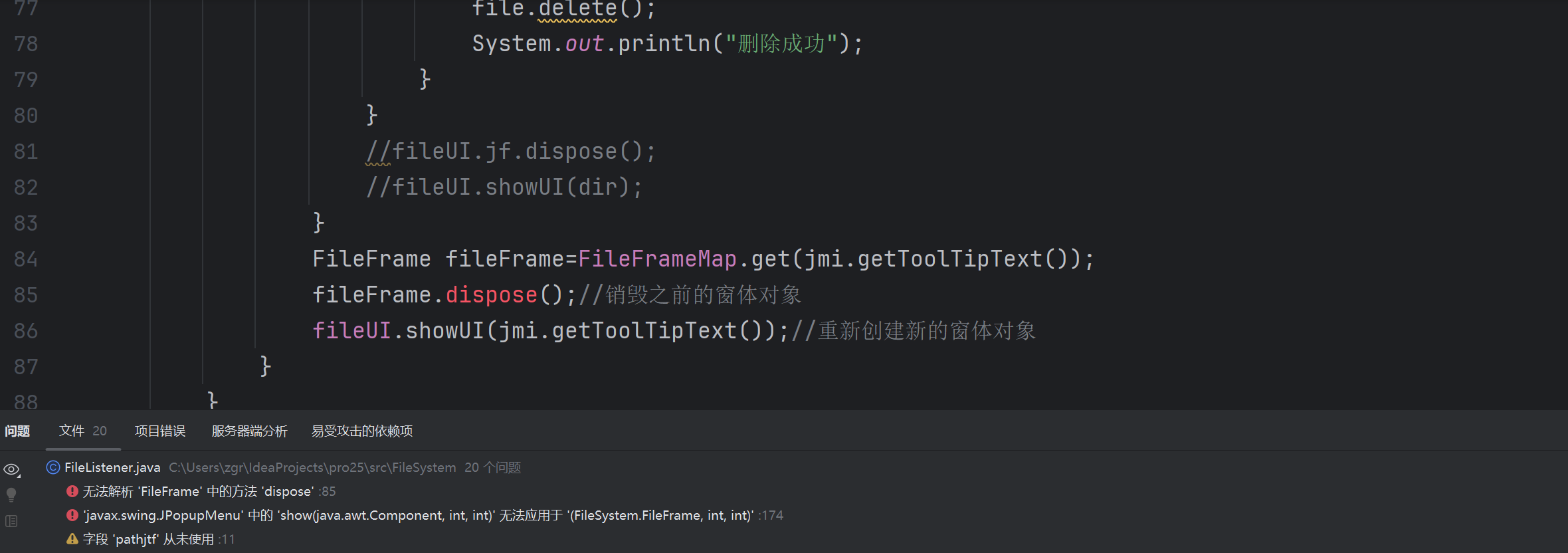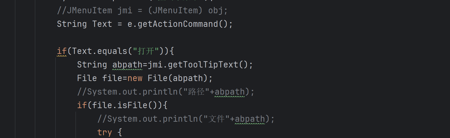 4.果然发现,这里我获取的路径是getToolTipText(),其实是这个文件夹的名字。因此将该路径获取转化为getActionCommand(),再把获取的abpath传给菜单项的getToolTipText(),作为正确的路径存起来。这样便能正常运行了。