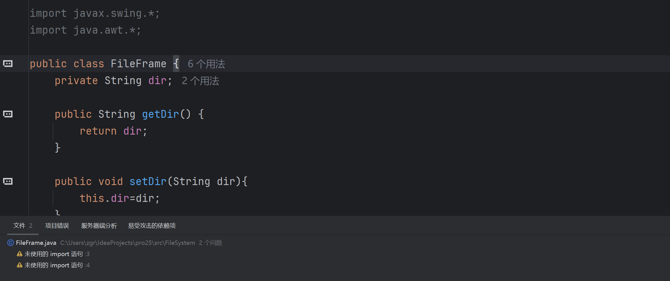 FileFrame作为基础窗口容器,主要负责维护当前窗口对应的目录路径,提供 get/set 方法供其他类访问和修改路径信息。