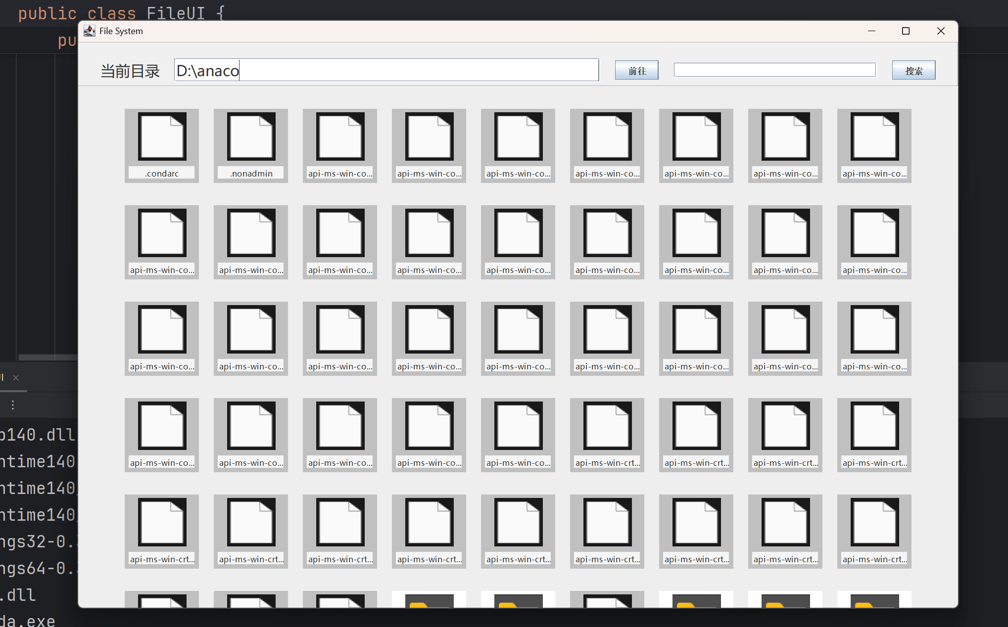 BorderLayout作为主布局,将界面分为北部(路径输入)和中部(文件展示); - 中部区域使用FlowLayout自动排列文件图标