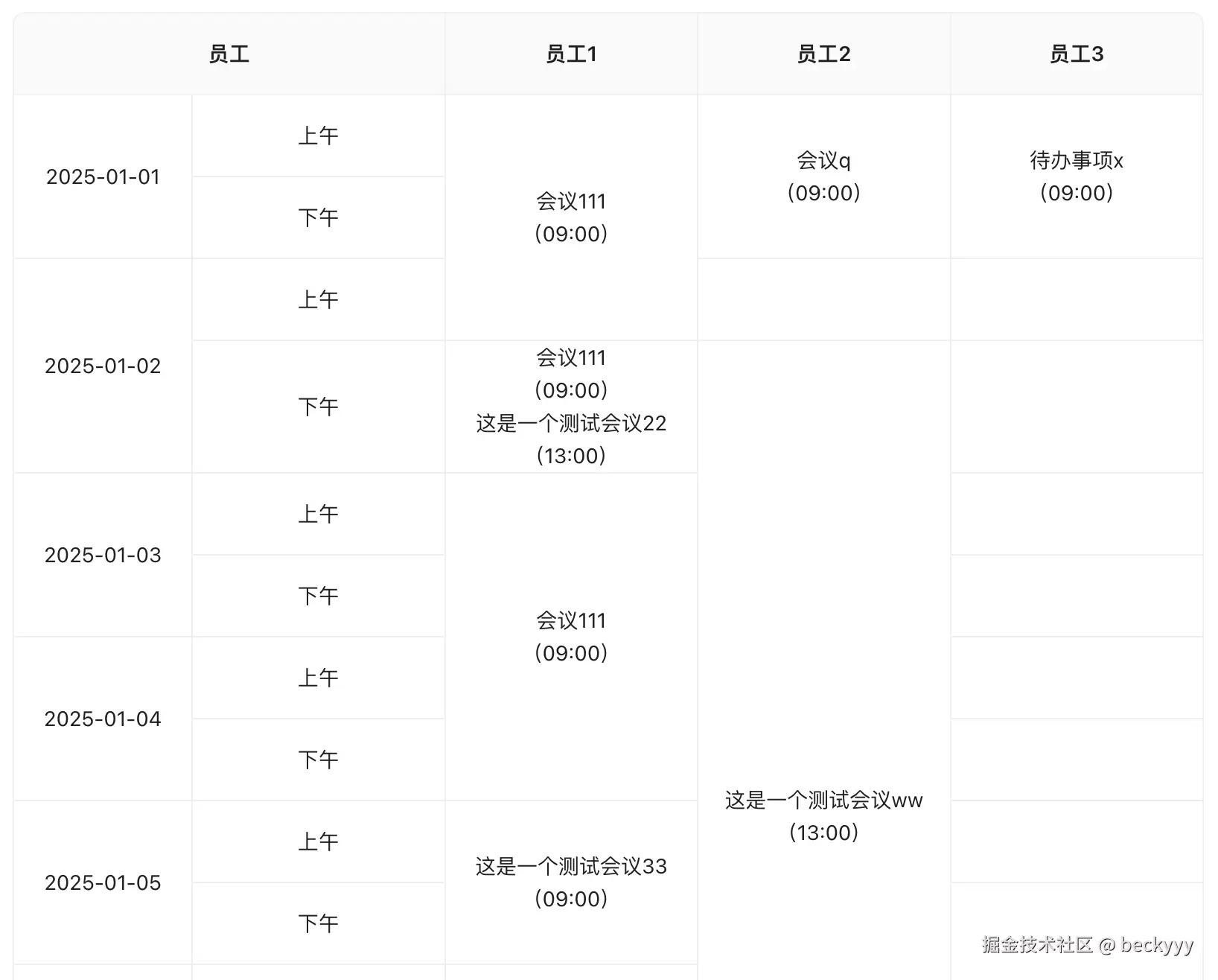 之前在外包做项目的时候,甲方提出一个想要合并单元格的需求,表格里展示的内容是领导们的一周行程,因为不想出现重复内容的单元格,实际场景中领导可能连续几天参加某个会议或者某个其他行程,本来 系统中对会议时间冲突是做了限制,也就是不能创建时间冲突的会议,那么对重复行程的单元格直接进行合并是没有问题的;但是后来又放开了限制、又允许存在会议时间冲突的情况了,因为实际中可能存在连续几天的大会行程中,又安排了几个小会,所以在后续的沟通中确定的方案是:单独的连续行程进行合并,如果中间出现多个行程就不合并,如果单独的长行程还没结束,后面连续的排期还是合并。最终的效果参考下图中的"会议111"。
