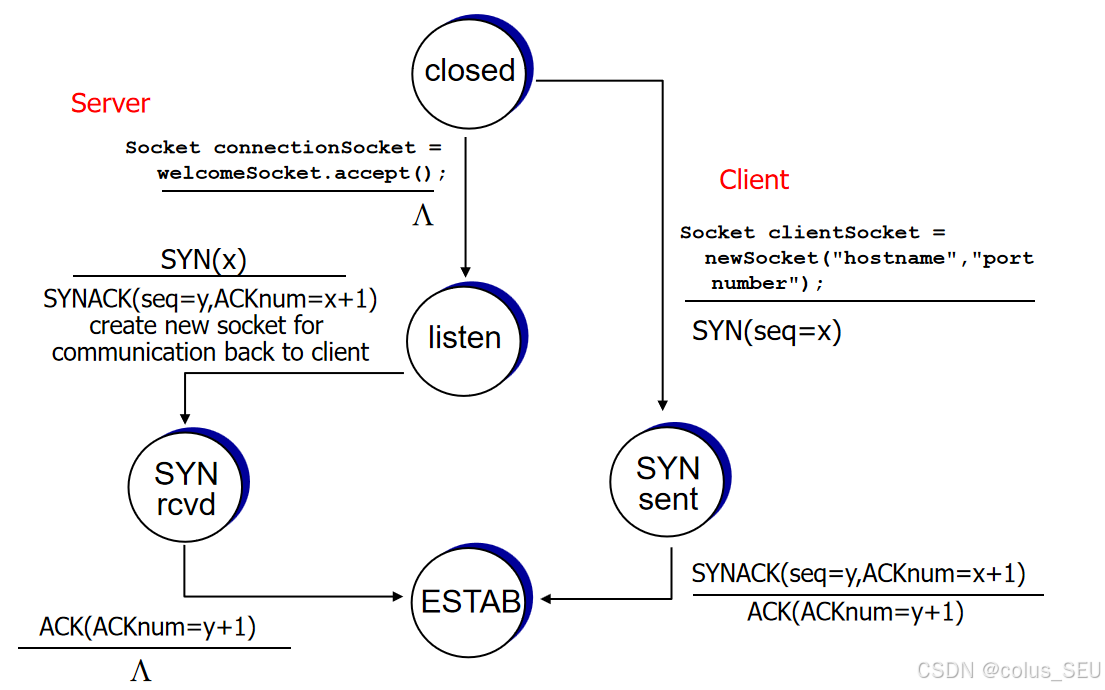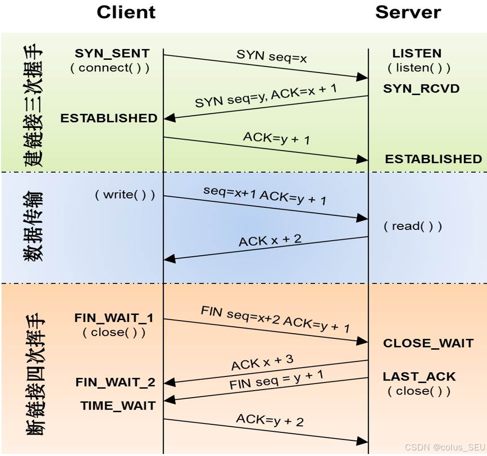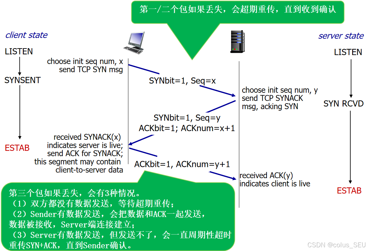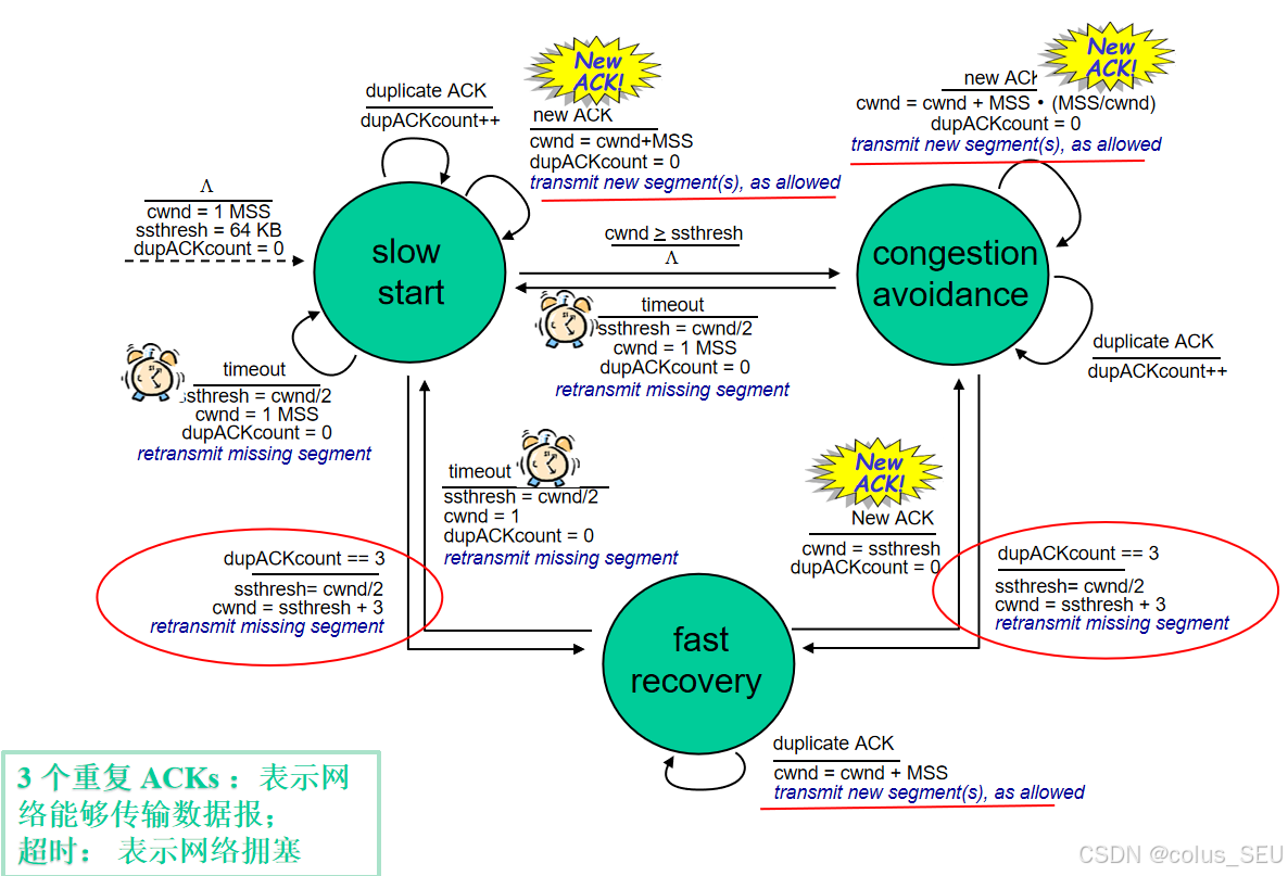 TCP拥塞控制通过一个状态机在三个核心状态间切换:慢启动 (Slow Start) 、拥塞避免 (Congestion Avoidance) 和 快速恢复 (Fast Recovery)。