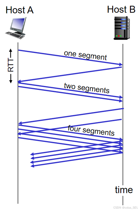 cwnd增加1 MSS。由于在一个RTT内会收到多个ACK,因此cwnd在每个RTT结束后会翻倍。 -