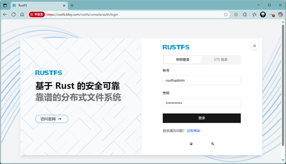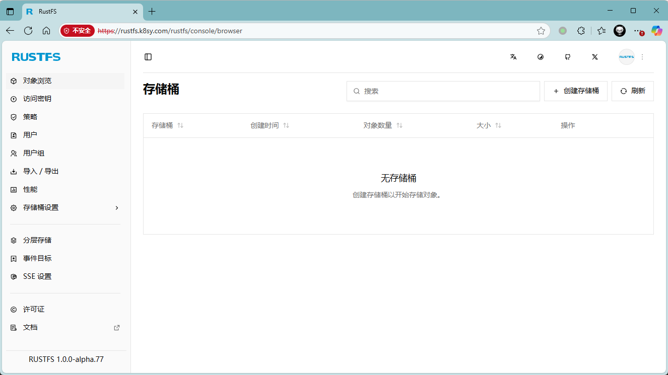 浏览器访问 https://rustfs.k8sy.com ,使用 rustfsadmin / rustfsadmin 登录。