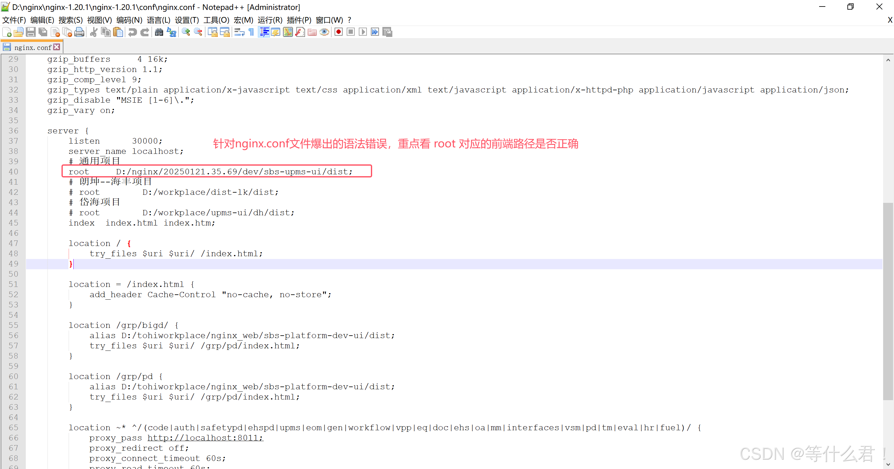 1.1重点关注 root 对应的前端路径(前端代码所在的文件夹路径) 是否有格式问题