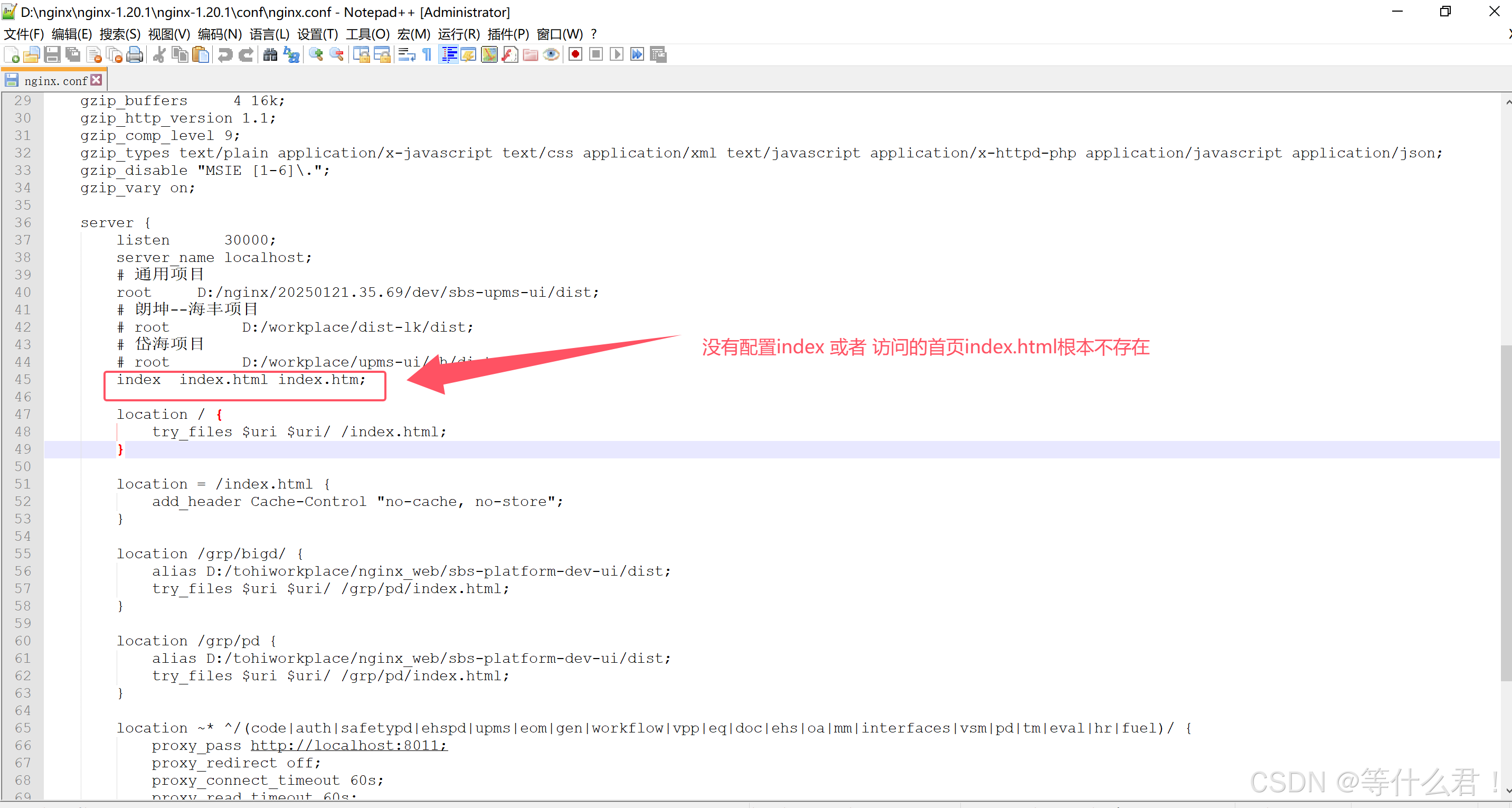 index 指令的作用是指定访问目录时默认加载的文件(比如 index.html、index.htm)。若未配置该指令,或配置的文件不存在,访问 http://localhost/(根路径)时,nginx 不知道该加载哪个文件,直接返回 404。