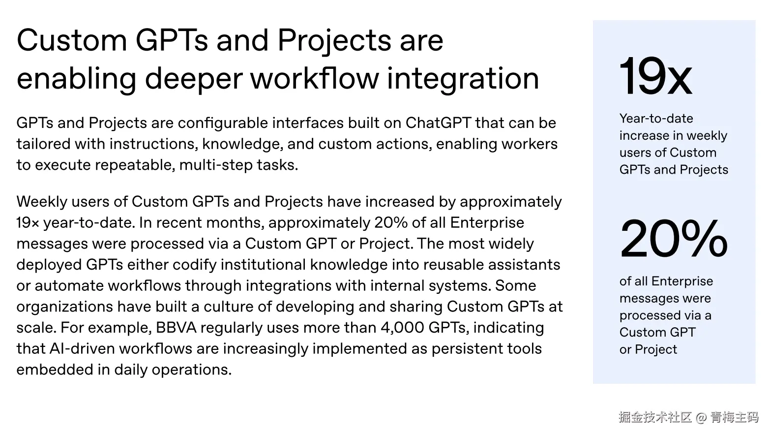 特别值得注意的是,Custom GPTs 和Projects 功能让AI更贴合企业需求。这些可自定义的工具,能加载公司知识库、连接内部系统,帮助员工执行重复的多步骤任务。今年,Custom GPTs 周活跃用户增长约19倍 ,约20%的企业消息通过它们处理。一些公司如BBVA 已部署超4000个自定义GPT,形成内部AI工具生态。