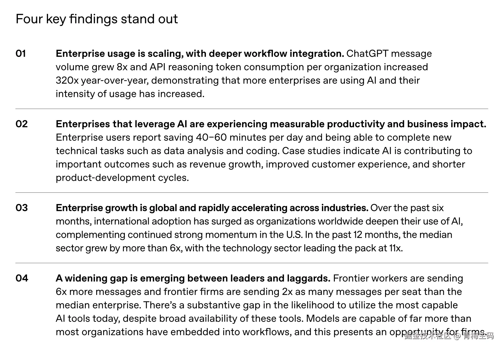 OpenAI首席经济学家Ronnie Chatterji在序言中指出,未来企业AI将向更强性能、更好组织上下文理解、复杂工作流委托方向演进。领先企业已开始系统整合数据、标准化工作流、加强变革管理,而多数企业仍有巨大追赶空间。