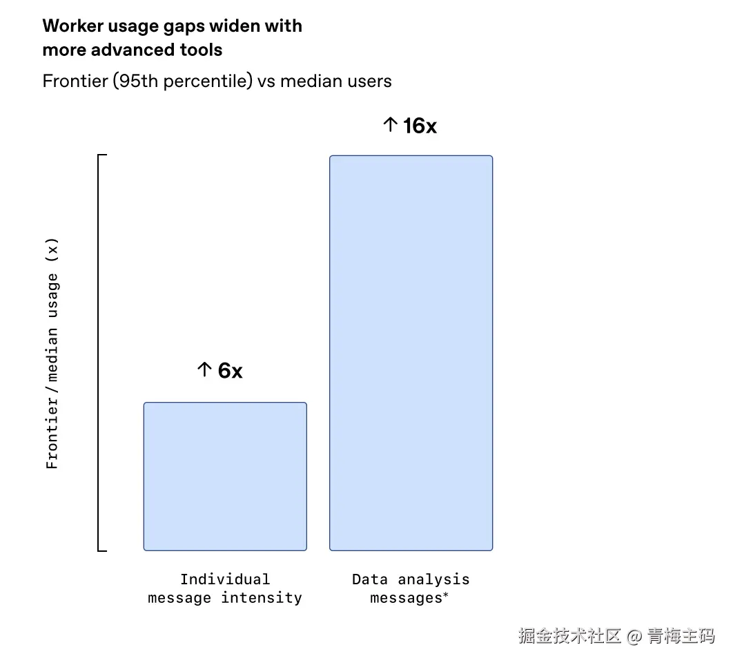 前沿员工(使用强度前 5%)发送消息量是中位员工的6倍 ,在数据分析任务上甚至达16倍 。编码任务差距最大,达17倍。