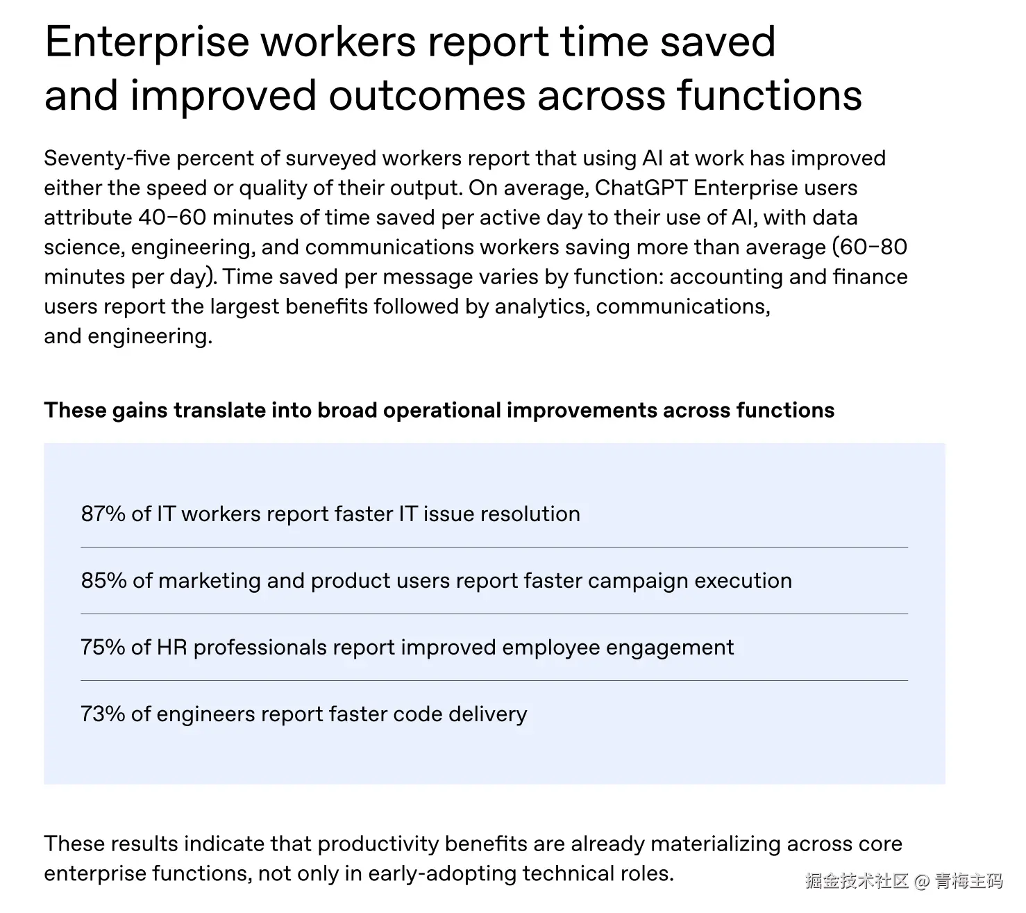 调研显示,75%的员工认为使用AI提升了工作速度或质量。平均每活跃日节省40-60分钟 ,数据科学、工程、沟通等岗位节省更多,可达60-80分钟。