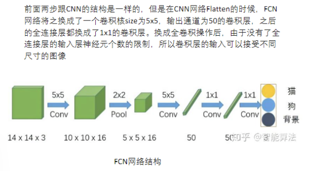 - 去全连接层: 传统的 CNN(如 AlexNet)最后有全连接层,要求输入尺寸固定。FCN 将全连接层替换为 1×11 \times 11×1 卷积层 ,使得网络可以接受任意尺寸的输入图像。
