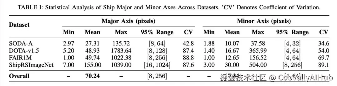 问题就出在这个P5层(步长32)上。论文通过对四大遥感船舶数据集(SODA-A, DOTA-v1.5, FAIR1M, ShipRSImageNet)的统计发现: