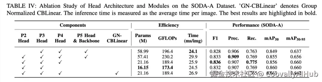 消融实验: 证明了"P2-P4"配置(同时加P2和减P5)远优于单纯"加P2"或"减P4"等策略,在各项指标上全面超越基线模型(YOLOv9-E)。