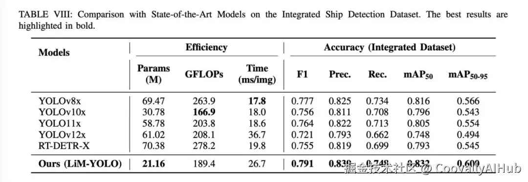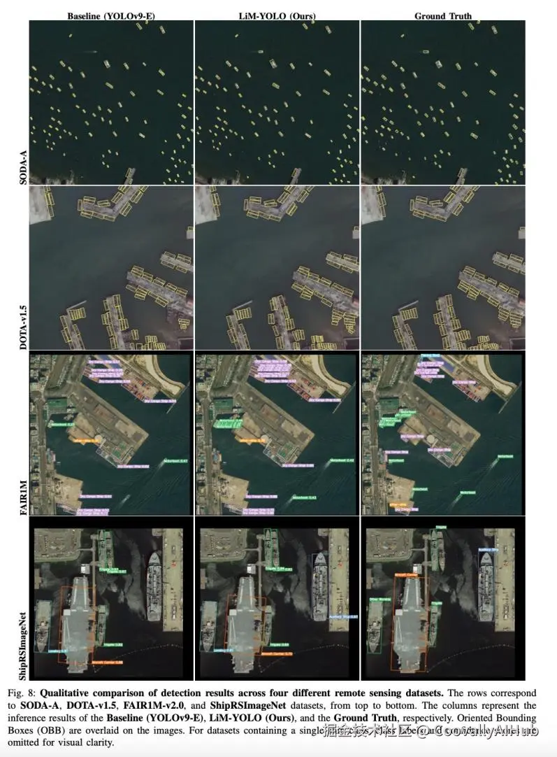 可视化效果: 定性结果显示,LiM-YOLO能够成功检测出基线模型漏检的密集、狭窄小型船舶,验证了其在空间细节保留上的优势。