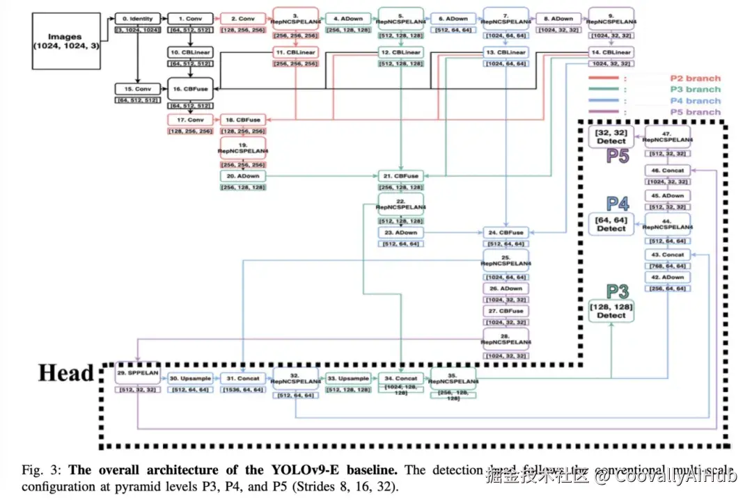 YOLOv9引入了可编程梯度信息(PGI) 和辅助可逆分支来缓解深层网络的信息瓶颈。这个辅助分支通常使用简单的1x1卷积(CBLinear),以保持线性、避免信息损失。