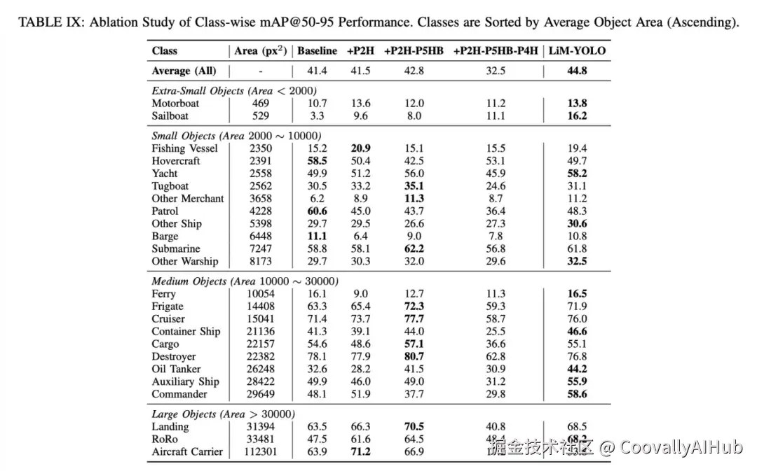 细粒度分类: 在包含24类船舶的ShipRSImageNet数据集上,LiM-YOLO对小尺度类别(如摩托艇、渔船)的检测提升尤为显著,同时保持了整体分类精度的领先。
