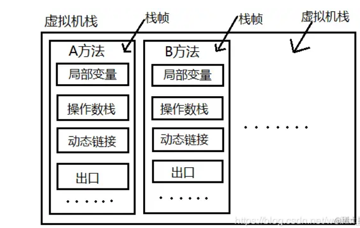 3、解释:虚拟机栈是有单位的,单位就是栈帧,一个方法一个栈帧。一个栈帧中要存储局部变量表,操作数栈,动态链接,方法出口等