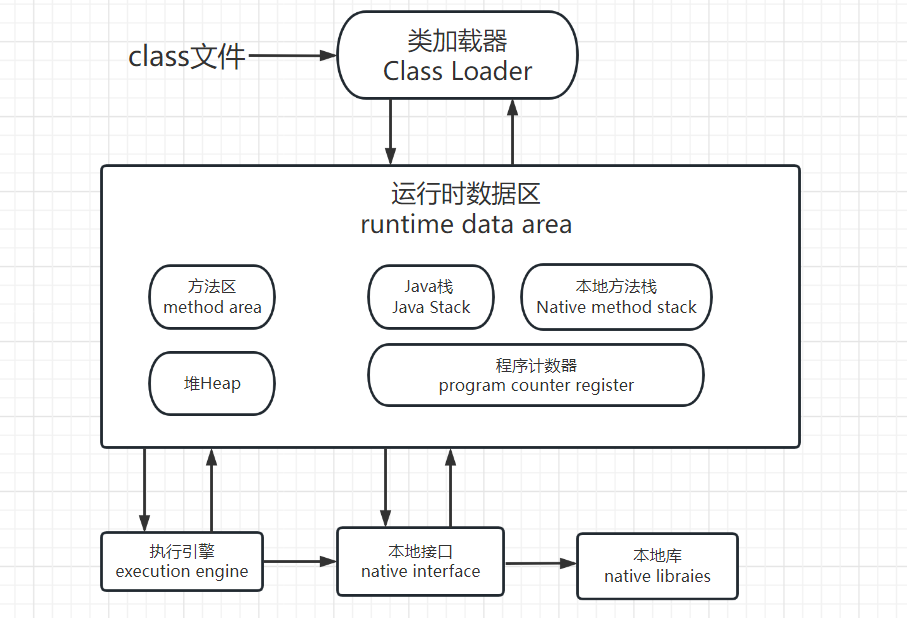 **运行流程:**首先通过编译器把java文件转换为字节码文件,类加载器把字节码文件加载到内存中,将其放在运行时数据区的方法区内。字节码文件是JVM的一套指令集规范,不能直接交给底层的操作系统来执行,因此需要特定的命令解析器执行引擎Execution engine,将字节码翻译成底层指令,再交给CPU去执行,而这个过程需要用到其他语言的本地库接口Native Interface来实现整个功能。