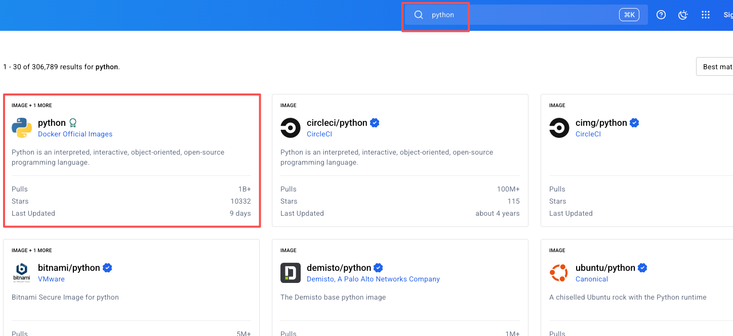 所有 Dockerfile 第一行都是 FROM 选择一个基础镜像,就是当前镜像是从哪个镜像的基础上面构建而来的,这里基础镜像需要自带python,可以去 Docker Hub 上面去查找符合要求的基础镜像。