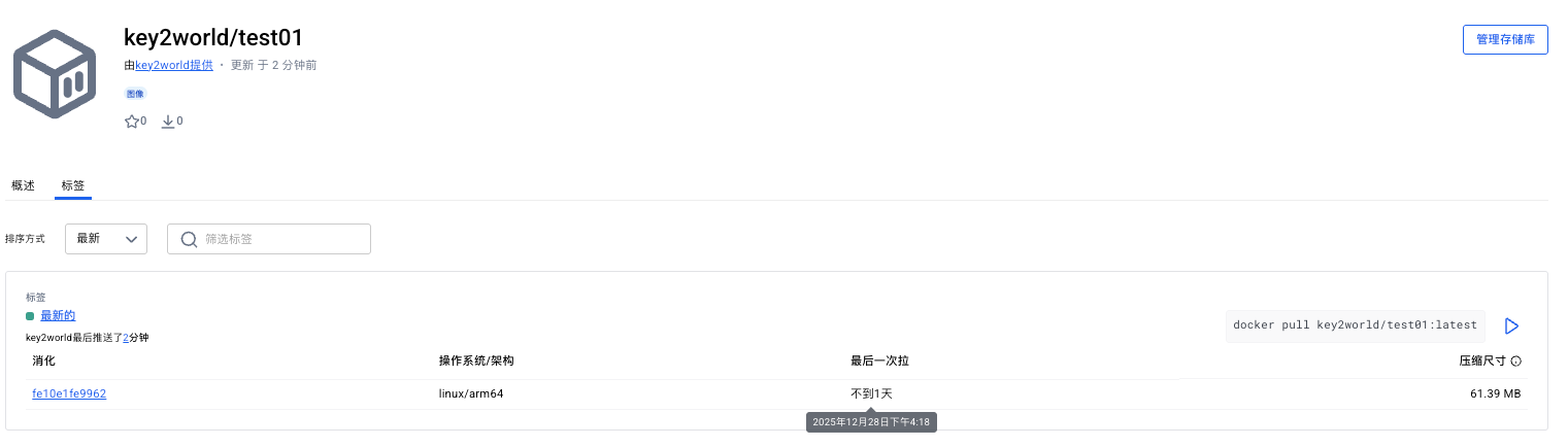 推送成功后使用命名空间和镜像名到 Docker Hub 查找。其他同学使用 docker pull key2world/test01 就可以下载这个镜像了。
