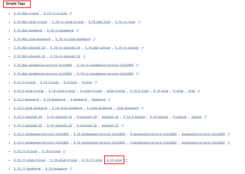 当前选择 3.13-slim(linux发行版是slim里面内置了python 3.13) 这个镜像作为基础镜像。