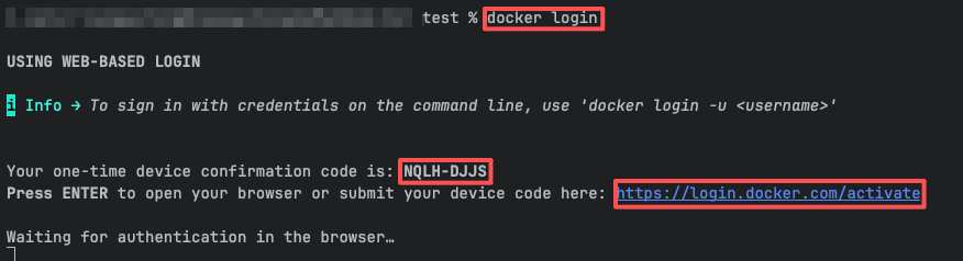 在控制台使用 docker login 命令进行登陆,给了一个验证码码和网站。