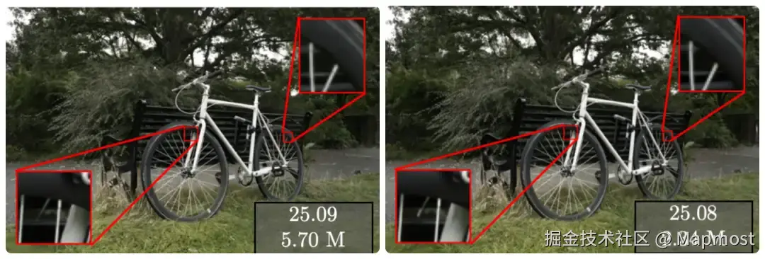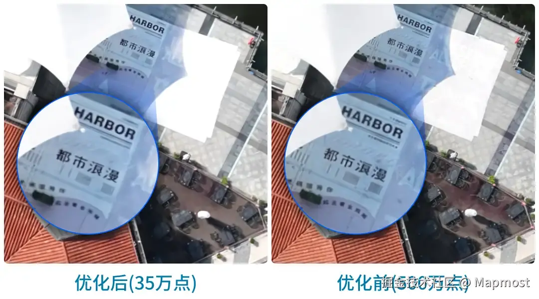 结合学术界压缩方法,我们在Mapmost高斯泼溅建模平台综合并改进了一套模型轻量化算法,可以在保证细节的情况下,最高达到14倍的压缩比。