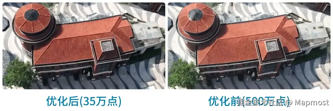 图中14倍压缩率情况下,模型体积从170MB降低至16MB,文字细节和屋顶轮廓仍然保持较高还原度。这样不仅减小了存储占用,同时也有利于建模和渲染性能的提升。