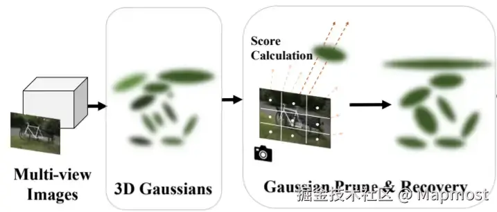 剪枝法认为直接限制椭球数量上限难以满足渲染质量的要求,因此一般是在训练过程中识别并逐渐删除对渲染质量贡献较小的冗余高斯。
