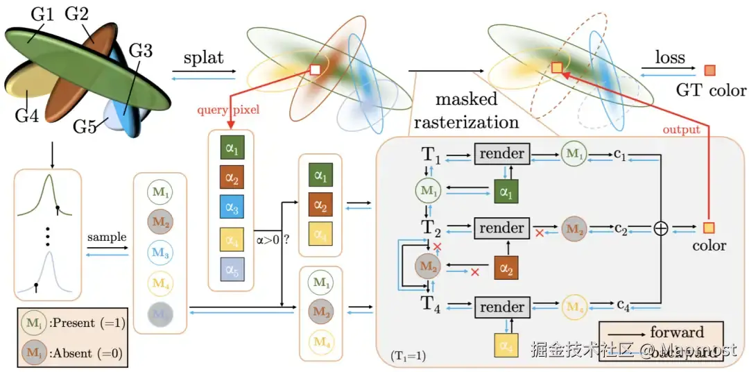 比如CompactGS方法思路较为直接,直接构建mask掩膜,为每个椭球分配一个二值变量(0或1),其中1表示渲染,0表示删除。虽然二值操作本身不可导,不能被优化,但是可以通过构造可导的间接变量,使得梯度可以传导至掩码。