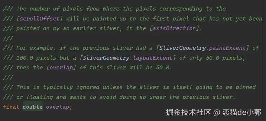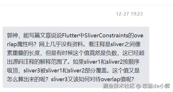 本期主要是应网友要求,写一个简单解答,其实 SliverConstraints.overlap 并不复杂,因为用起来也很简单,但是如果没正确理解它作用的时候,就会出现类似这位网友的困惑,确实官方的注释写的可能太过抽象,以至于如果你想通过注释理解它的作用,会感觉比较晦涩难懂: