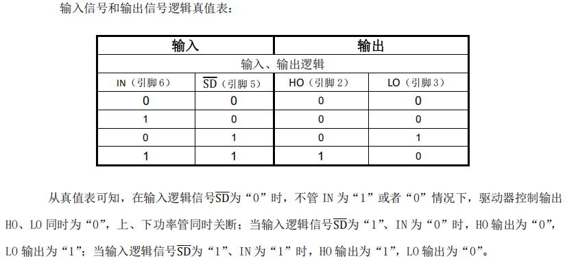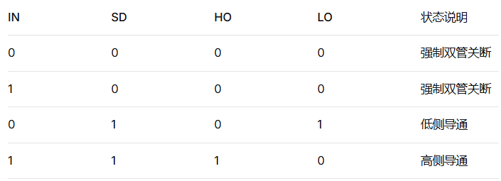 IN = 1 → LO = 低,HO = 高(高侧导通) - SD(Pin5)关断控制(低电平有效):