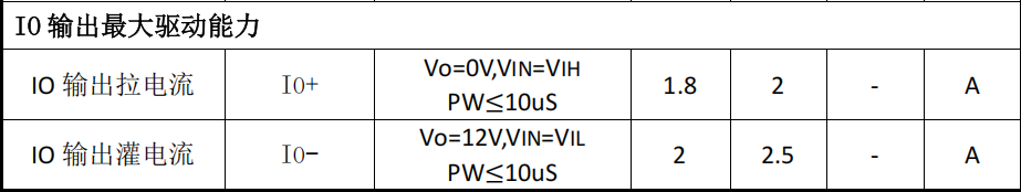 - 输出灌电流(IO-):典型 2A,最大 2.5A(Vo=12V,脉宽 ≤ 10μs)