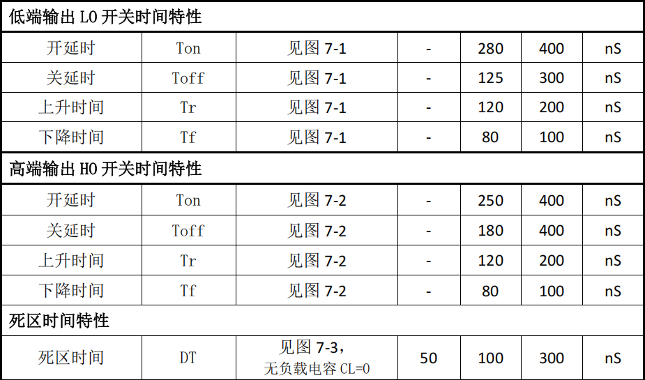 上升/下降时间与 LO 相近,对称性好 - 死区时间(DT):典型 100ns(范围 50ns--300ns),内置防直通