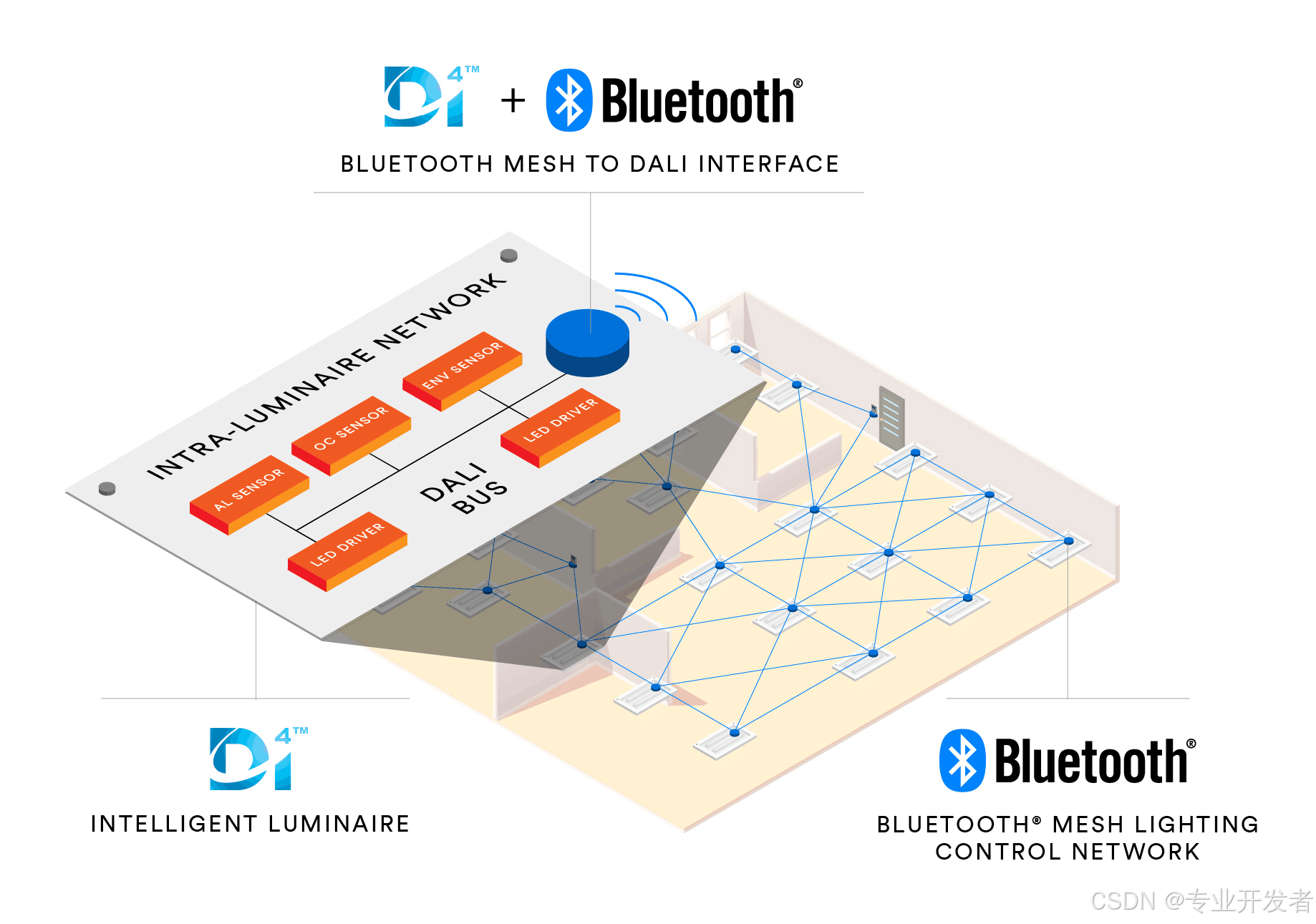 简而言之,DALI(搭载面向智能灯具的领先物联网标准 D4)正与蓝牙(智能照明控制网络的领先标准)展开合作。这一合作确保系统的所有组件 ------ 传感器密集型灯具与照明控制器 ------ 都能相互理解、顺畅互操作,让价值链上的所有参与者(包括终端用户)都能更轻松地获取价值。