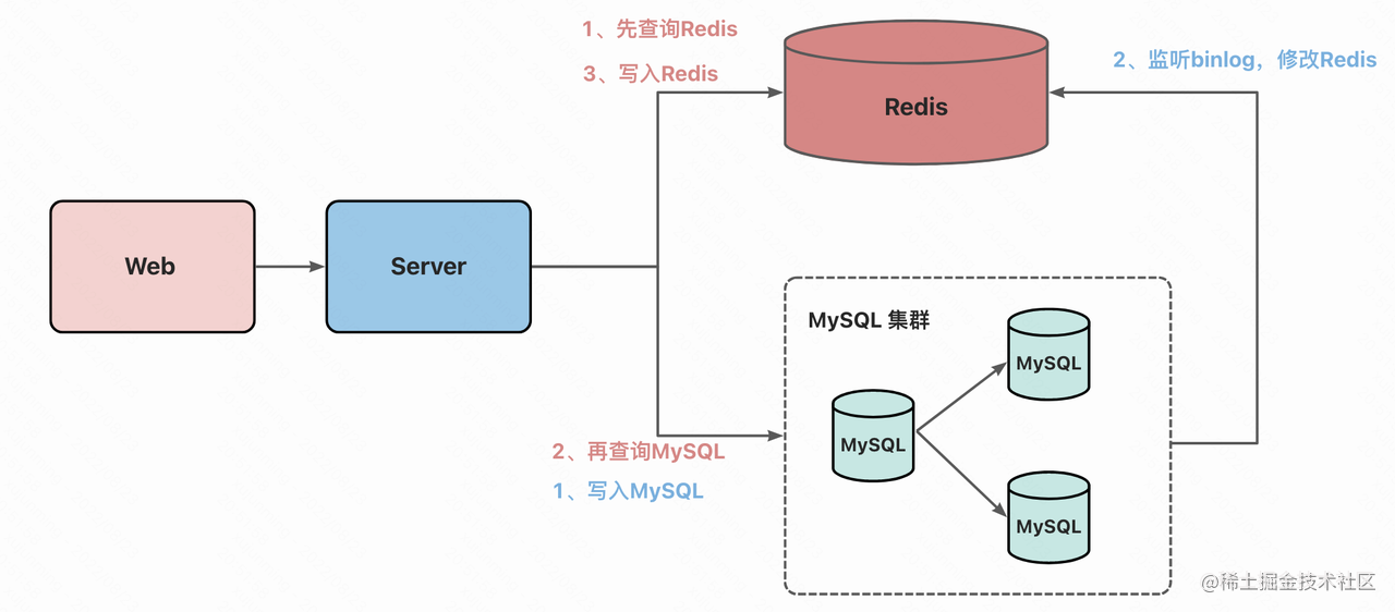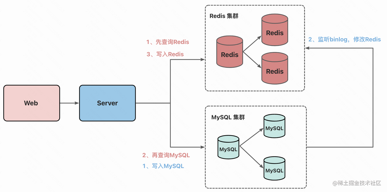 这样就得到了下面这张架构图:在我们读写数据的时候,先会去 Redis 中读取,如下图红色 1 所示;如果 Redis 命中,直接返回数据,结束此次查询;如果 Redis 未命中,则执行下图红色 2 步骤,从 MySQL 集群读取目标数据;在将数据返回的同时,Server 会执行下图的红色 3 步骤,将从 MySQL 中获取的数据,写入到 Redis 中缓存,等待下次读取。