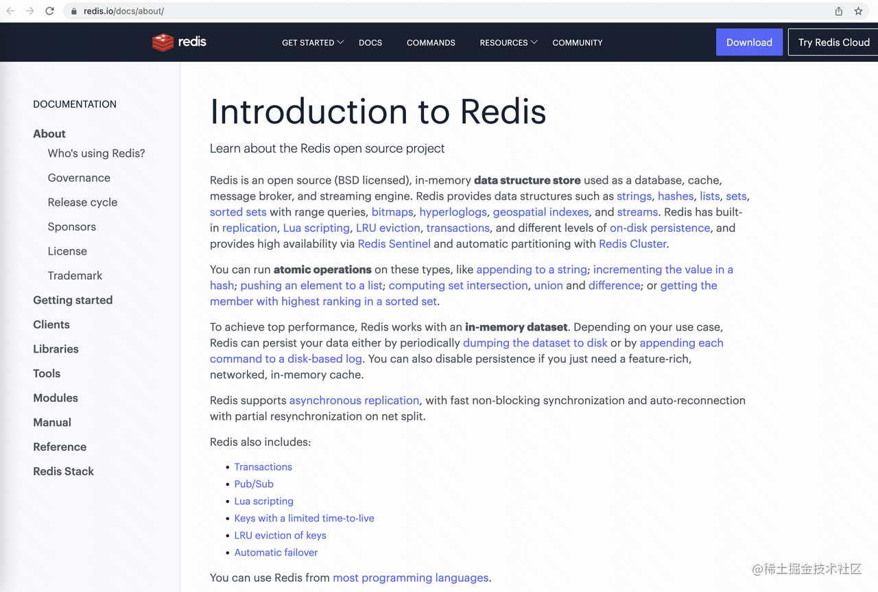 一般我们看一个东西是什么的时候,都是去官网上看一下 Introduction, 那我们 Redis 官网(https://redis.io/)走起,如下截图: