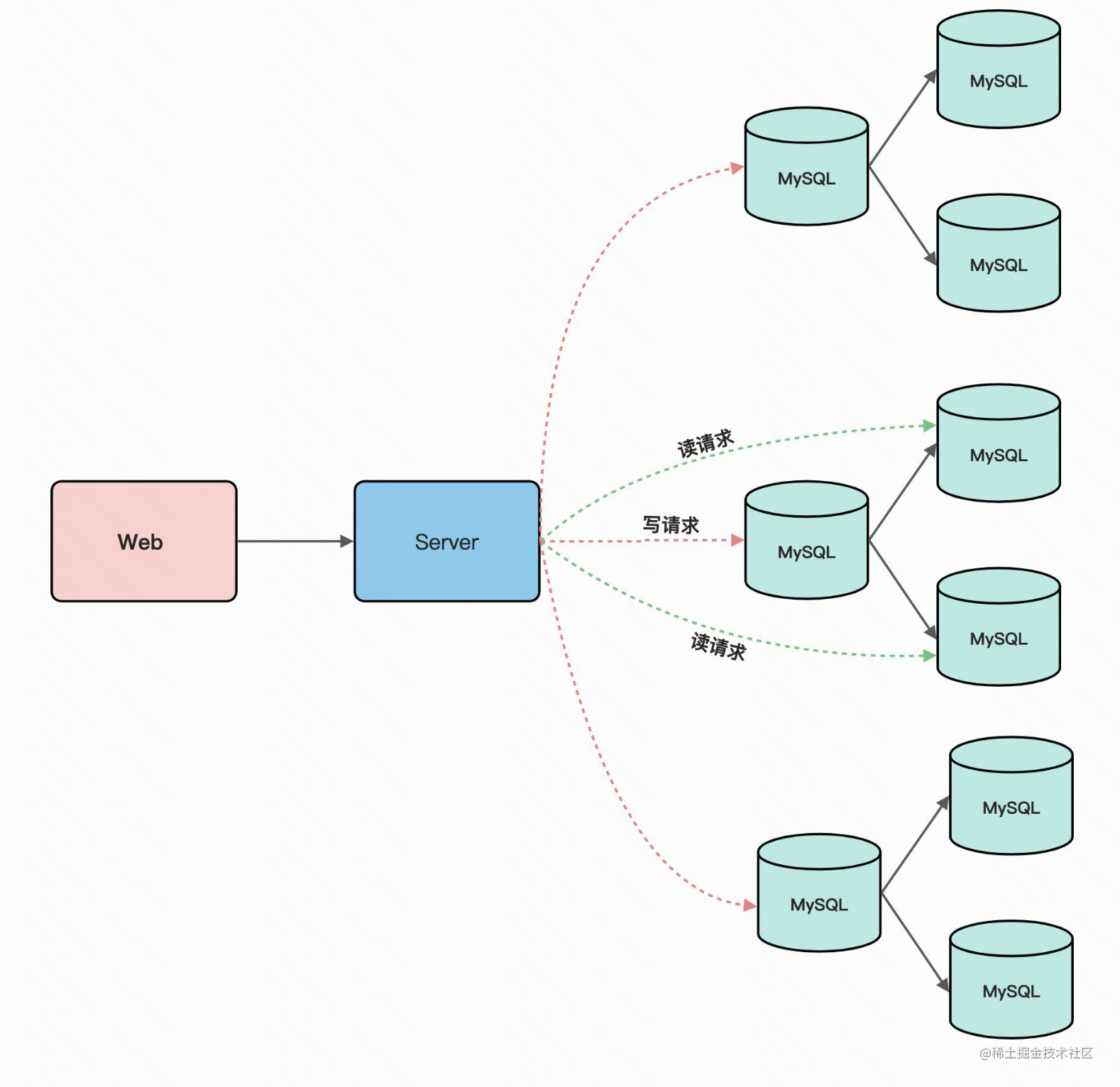 其实,这种情况也是依赖 Java 里面的数据库中间件,它可以识别出一次数据库操作到底是 select 语句,还是 insert、update 或者 delete 语句。如果是修改数据的话,会把 SQL 语句发到主库上执行;如果是查询数据的话,select 语句就会把请求打到从库上。
