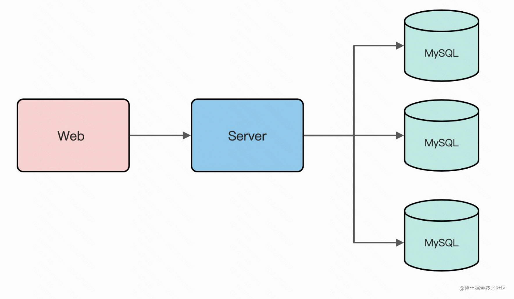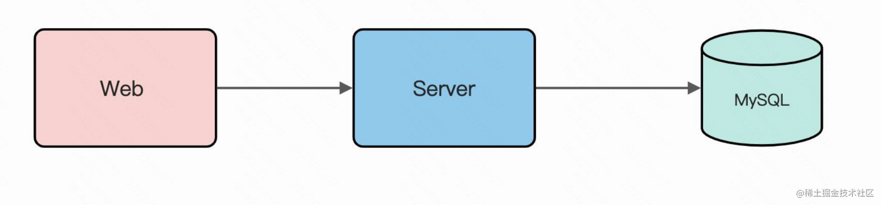 服务最开始的时候,是只有一个 MySQL 存储,就和下面这张图一样:用户通过浏览器来发一个请求,会打到 Java 服务器上,就是我们用 Spring 、MyBatis 之类的框架写的这个后端的 Java 服务,然后,这个后端的服务会访问 MySQL,去查询数据或者是写入数据。