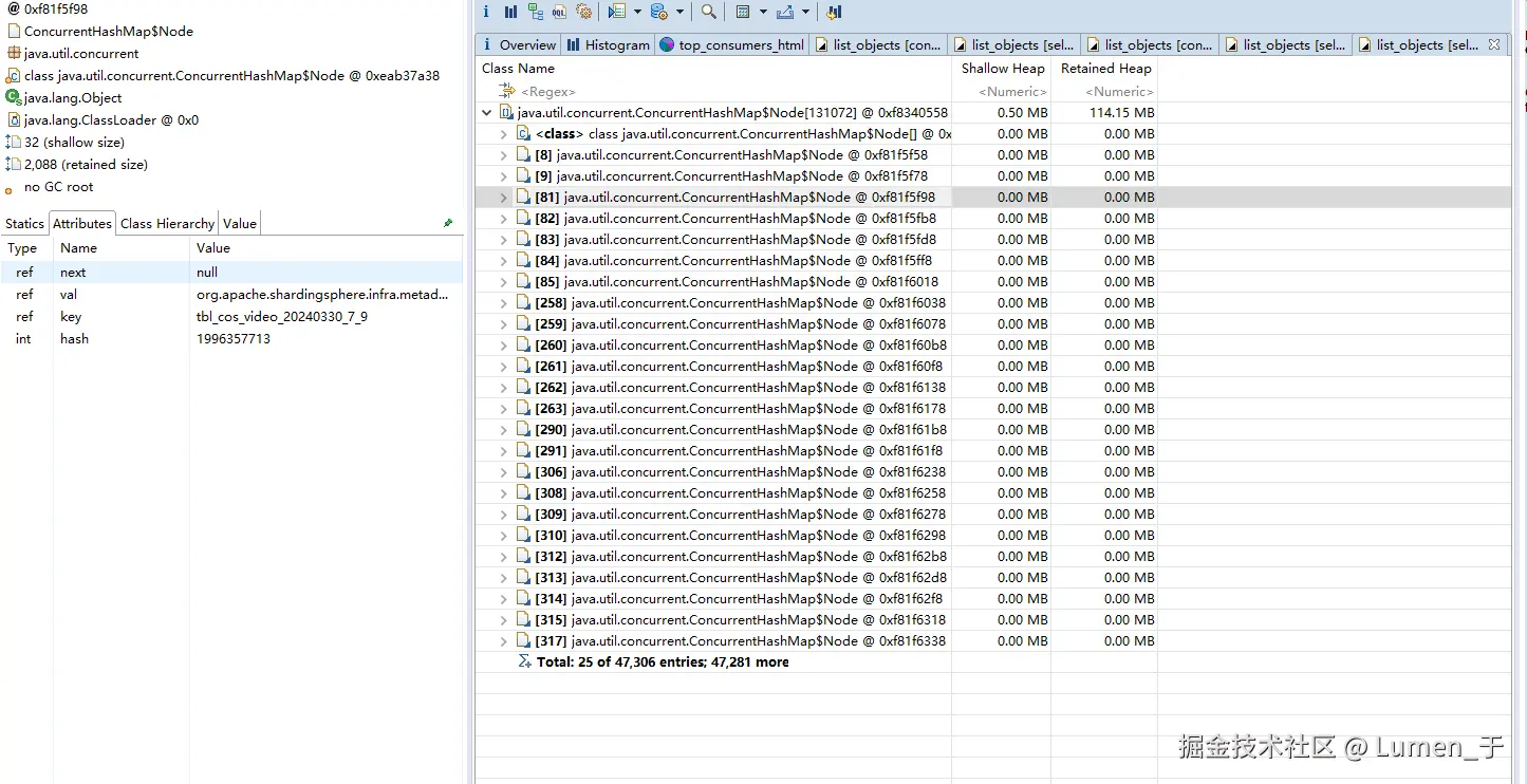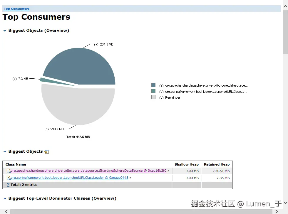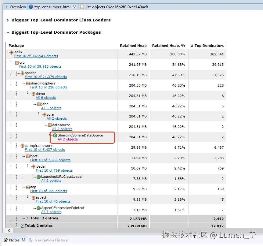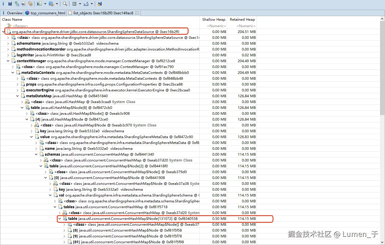 发现大对象是ShardingSphereDataSource,查看这个对象的外引用发现是数据库表实例;