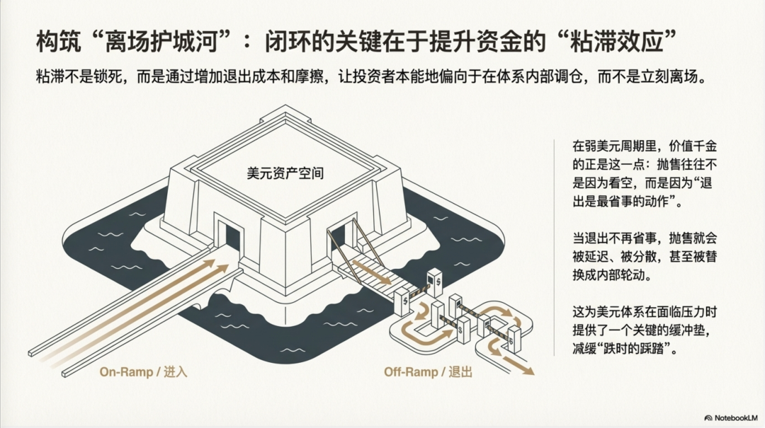 闭环一旦跑起来,最有意思、也最容易被误解的部分,其实不是"钱怎么进来",而是"钱为什么不那么容易出去"。这里的关键词叫粘滞效应。但必须先把话说清楚:粘滞不是锁死,更不是某种阴谋论式的"囚禁资金"。它更像资产配置里的一个常识------当退出成本上升、再进入成本也不低时,投资者在做再平衡(rebalancing)时会本能地偏向"少走那扇门"。哪怕你对某个市场没那么乐观,只要彻底离场的摩擦足够大,你也更可能选择在体系内部调仓:从高风险换到低风险,从长久期换到短久期,从波动资产换到现金管理,而不是马上把资金抽回本币体系重新开始。摩擦改变的不是"能不能做",而是"多快做、做多少、在什么情境下做"。弱美元周期里最值钱的恰恰是这点:抛售往往不是因为看空本身,而是因为"退出是最省事的动作"。当退出不再省事,抛售就会被延迟、被分散,甚至被替换成内部轮动。