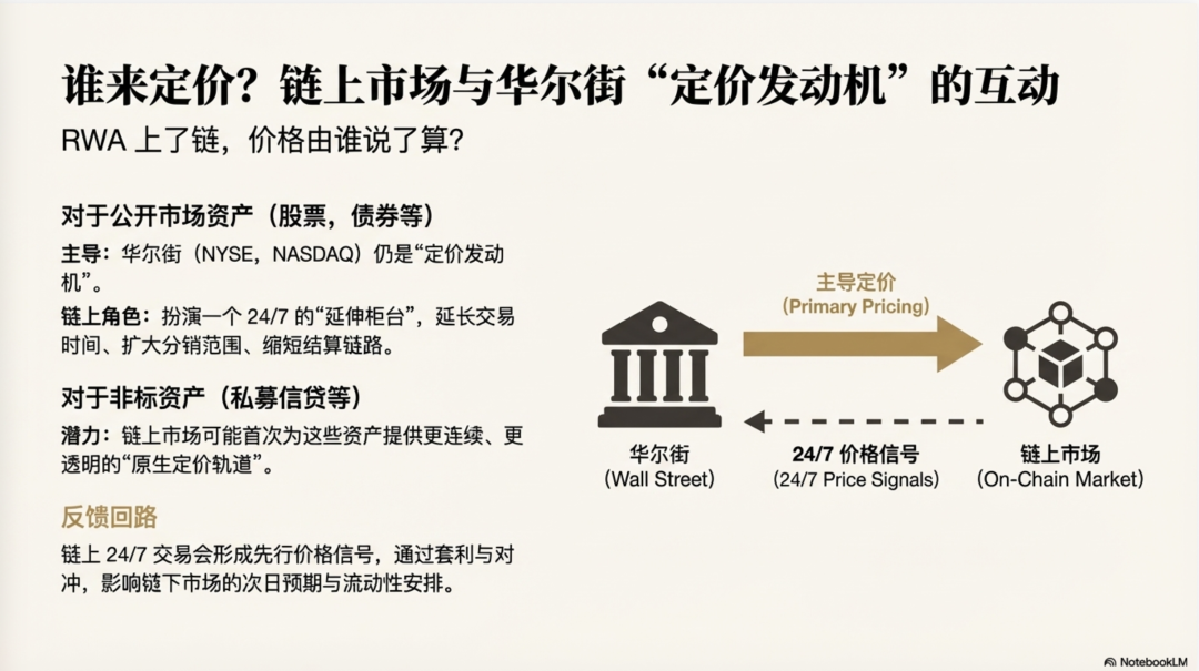我相信,对那些公开市场资产的映射品(比如美股、指数、可交易债券的链上版本)来说,在可见的未来,华尔街仍然会把价格发现放在主市场手里------NYSE、NASDAQ 以及它们背后的做市与信息体系仍是"定价发动机",链上更像一个 24/7 的延伸柜台:把交易时间拉长,把分销范围推到全球,把结算链路缩短。真正可能在链上生长出"原生定价"的,反而是非标RWA:私募信贷、应收账款、基金份额这类资产本来就不以连续交易定价为特征,价格更依赖披露、评级、尽调与风控框架;当披露与风险管理足够成熟、做市与清算机制建立起来,链上市场反而可能第一次为这些资产提供更连续、更透明的定价轨道。更微妙的是"反馈回路":链上 24/7 连续交易会在夜间和事件冲击时先形成价格信号,套利与对冲会把这个信号带回链下,影响第二天的预期与流动性安排------这不意味着链上取代链下,但意味着信息与流动性的传导方式正在改变。再叠加制度先发与基础设施深度,一套"默认选项"效应就会出现:规则越确定、流动性越深、结算越顺滑,美元资产越容易成为全球投资者顺手拿来配置的那一篮子资产,甚至成为新一代投资者资产负债表上的"出厂设置"。