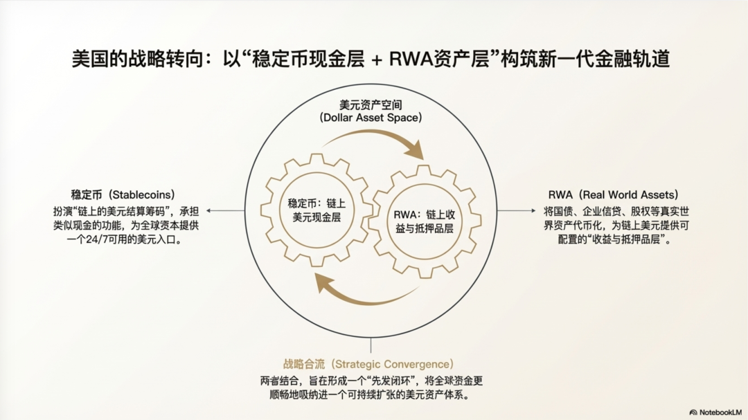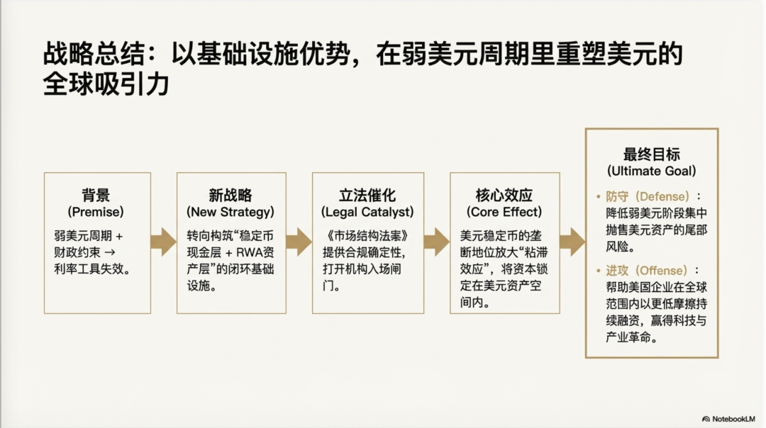 与不少人的理解不同,《市场结构法案》并不是要规范野蛮生长了十多年的加密市场,而是要打开美国 RWA 资产铸造的阀门,让稳定币与RWA 合流,形成一个"先发闭环":稳定币提供链上可结算的"美元现金层",RWA提供链上可配置的"收益与抵押品层",两者共同把全球资金更顺畅地吸纳进一个可持续扩张的"美元资产空间"。在弱美元周期里,这个闭环关键价值不在于让美元立刻转强,而在于通过"相对粘滞效应"降低投资者集中抛售美元与美债的尾部风险,把部分"离场压力"转化为体系内的换仓与再配置;同时,在科技革命与产业升级的关键阶段,它为美国及美国企业提供一种跨时区、可规模化的全球融资与资产分销机制,从而在不必完全依赖抬高国债收益率来留住资本的情况下,继续从全世界吸收资金、扩展资产负债表与创新投入。