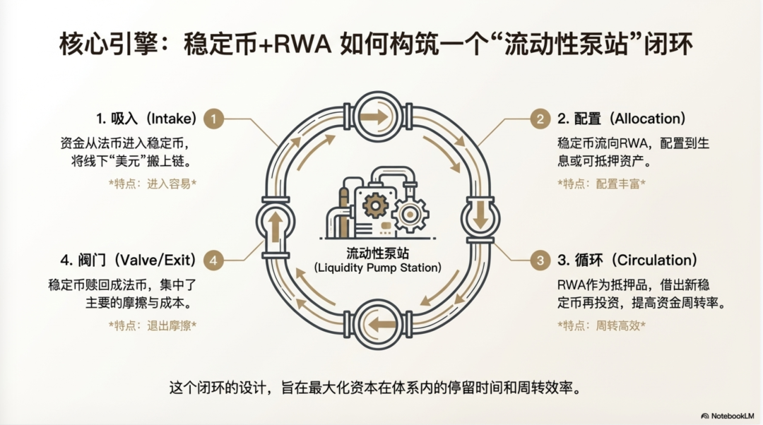 一旦把稳定币与 RWA 放在同一张图里,你会发现它们的组合更像一座"流动性泵站",而不是两种彼此独立的金融创新。泵站的最小结构其实非常朴素:资金先从法币或银行存款进入稳定币,把线下的"美元"搬上链,变成随时可结算的"链上美元现金";随后再从稳定币流向 RWA,把这笔链上现金配置到能产生收益、或至少能充当抵押品的资产上;接着,资产层开始发挥它的"周转"属性------RWA不只是拿着收息那么简单,它可以被抵押,借出新的稳定币,再去买入更多资产或参与其他配置,这就把原本线性的一次投资,变成了一个可循环的资金回路;最后,真正的摩擦集中在"退出"环节:稳定币要赎回成法币,往往要穿过银行体系、合规审查与通道成本,这条路并非堵死,但足够狭窄,足够昂贵,因此在很多场景里,资金更倾向于在链上体系内部换仓而不是立刻离场。把这四步串起来,闭环就出现了:进入容易、配置丰富、周转高效、退出摩擦集中------这就是泵站的基本形态。