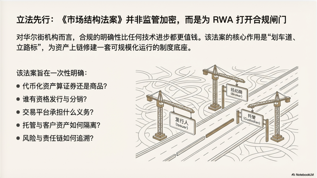 很多人把《市场结构法案》想成"给加密市场亮绿灯",这完全是误读。这个法案其实是在为"资产上链"修一套可规模化运行的制度底座:把代币化资产究竟归谁管、算什么属性、谁能发行、谁能交易撮合、经纪与托管应承担什么义务、客户资产如何隔离、信息披露与风控标准如何落地等关键环节一次性"划车道、立路标"。对华尔街机构而言,这种明确性比任何技术进步都更值钱------当合规边界从灰色变成可预期,法律不确定性成本就会显著下降,资本、产品与业务流程才敢迁移到链上;而一旦机构化供给开始稳定涌入,链上市场就不再只是零散试验,而有机会形成可持续的流动性与信用积累,最终为稳定币与RWA的闭环扩张提供制度保障。