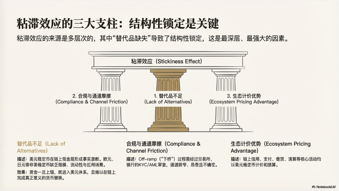 从这个角度看,粘滞的三种来源需要重新排列其轻重缓急。第一是"替代品不足"------也就是非美元稳定币的深度与流动性不足,导致链上缺乏一个可以与美元稳定币平行竞争的现金层。第二才是合规与通道摩擦:稳定币要回到法币世界,通常要经过交易所、银行、支付机构与一系列合规审查;KYC/AML(身份与反洗钱审查)、银行的风险偏好、各地对 VASP(虚拟资产服务商)的监管收紧,都会让 off-ramp(链上资金"下桥"到法币账户)更窄、更贵、更不确定。第三是生态计价优势:链上信用、支付、借贷、做市与清算的默认计价单位高度美元化------当交易、抵押、清算都以美元稳定币为主时,你持有非美元资产不仅要承担汇率风险,还要承担"使用不便"的机会成本。