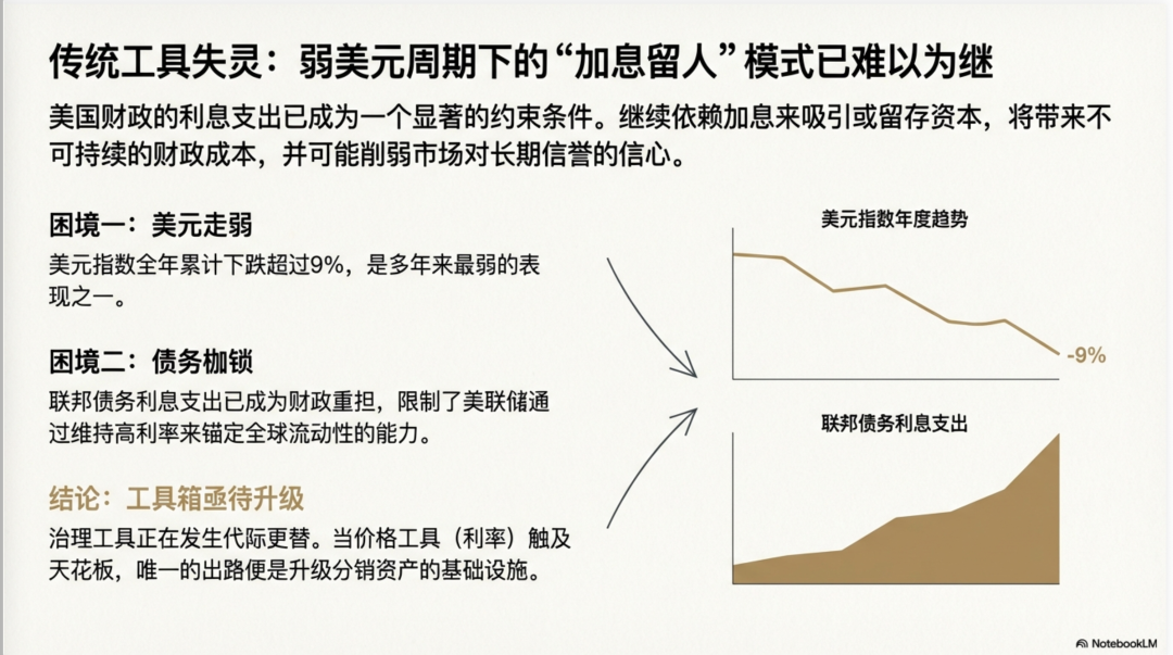 目前的宏观天平正处于一个微妙的时间节点:美元正步入一个由多重因素交织驱动的贬值周期。按照教科书式的逻辑,为了对冲本币走弱带来的资本外逃,美联储本应通过维持高利率来锚定全球流动性,但在联邦债务利息支出已然成为财政重担的今天,这种"靠涨息留人"的传统手段正变得空前昂贵且难以为继。华尔街的精英们敏锐地察觉到,治理工具正在发生代际更替------当价格工具(利率)触及天花板,唯一的出路便是升级分销资产的基础设施。