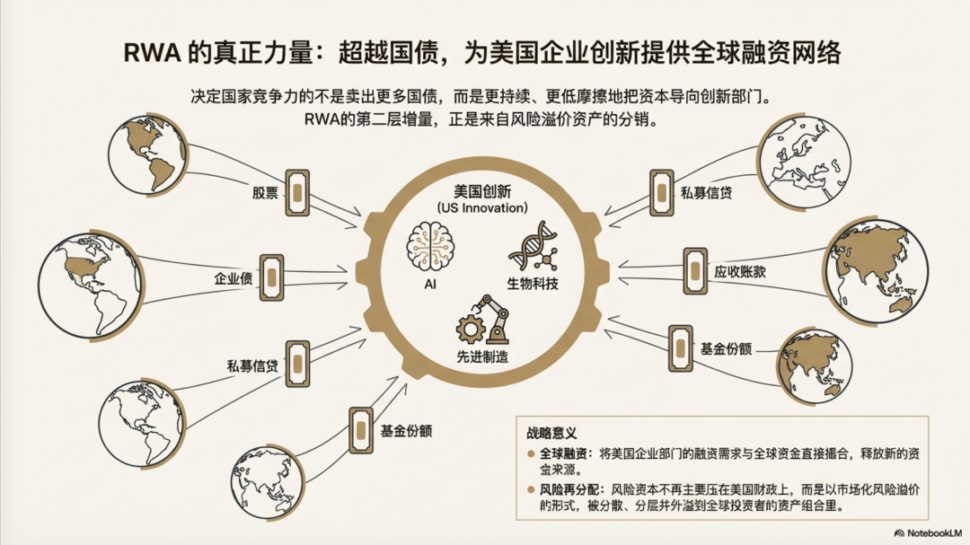 真正的第二层增量,来自风险溢价资产的分销:股票、企业债、私募信贷、应收账款、基金份额,乃至某些结构化产品与股权类权益。这一层更贴近"企业融资"与"风险定价",因为它不再是把国债收益搬上链,而是把美国企业部门的融资需求与全球资金更直接地撮合起来------把原本只对少数机构开放、手续繁复、交易不连续的资产池,拆得更细、卖得更远、结算得更快,从而释放新的资金来源。更重要的是,它还隐含着一种风险再分配:当更多资金通过链上RWA进入美国企业资产与信用资产,美国创新与扩张所需的风险资本就不再主要压在联邦政府资产负债表上,也不必通过"提高国债利率"来硬拉资金,而是以市场化的风险溢价形式,被分散、分层并外溢到全球投资者的资产组合里------收益更诱人,风险也更真实,但风险的承受者从"美国财政"更多转移为"全球资本"。这正是RWA在科技革命窗口期最关键的含义:它把美元从单纯的货币与国债体系,推进到一个更具扩张性的"全球融资与风险承载网络",让美国企业可以在全球范围内持续吸纳资本,同时把创新的不确定性通过金融结构更广泛地分摊出去。